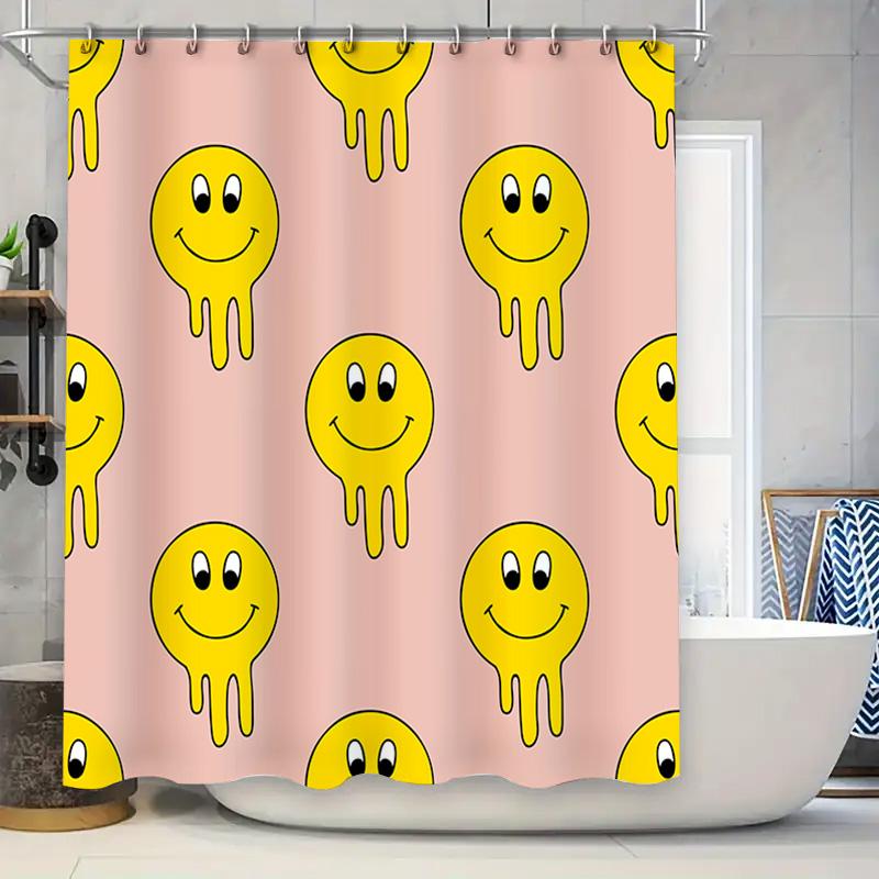 Happy Smiley Face Shower Curtain Pink Background with Yellow Cartoon Character Design for Bathroom Decor