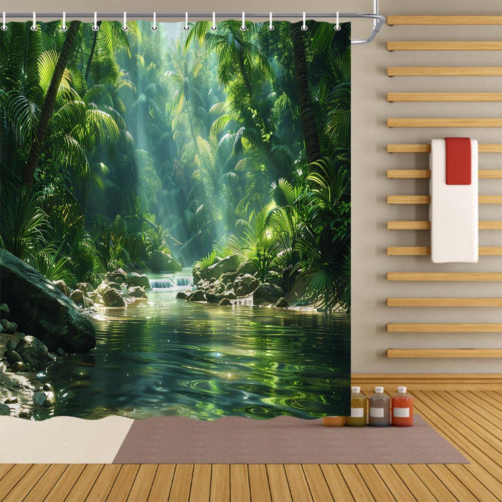 Tropical Jungle Shower Curtain Green Forest River Scene Nature Art Calm Wilderness Decor Waterproof Printed Bath Curtain Home