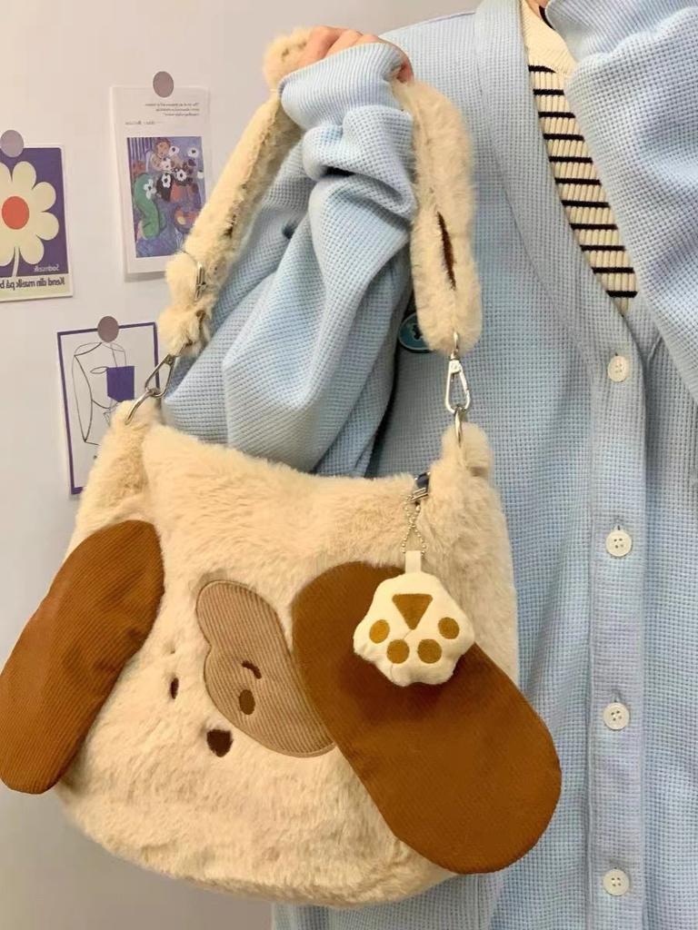Cute Puppy Embroidered Handbag Autumn And Winter Plush Large Capacity Schoolgirl Shoulder Bag Underarm Bag Commuter Bag