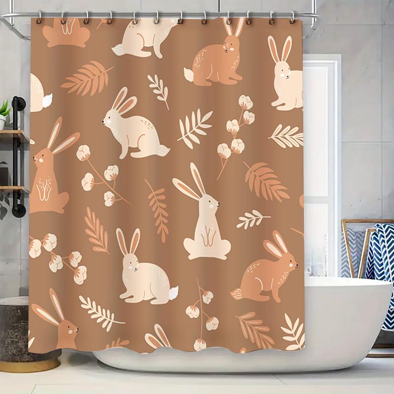 Cute Rabbit Shower Curtain Set with Green Leaves Decor Modern Bathroom Curtains for Kids' Room Peach Pink Beige Floral Print Wat