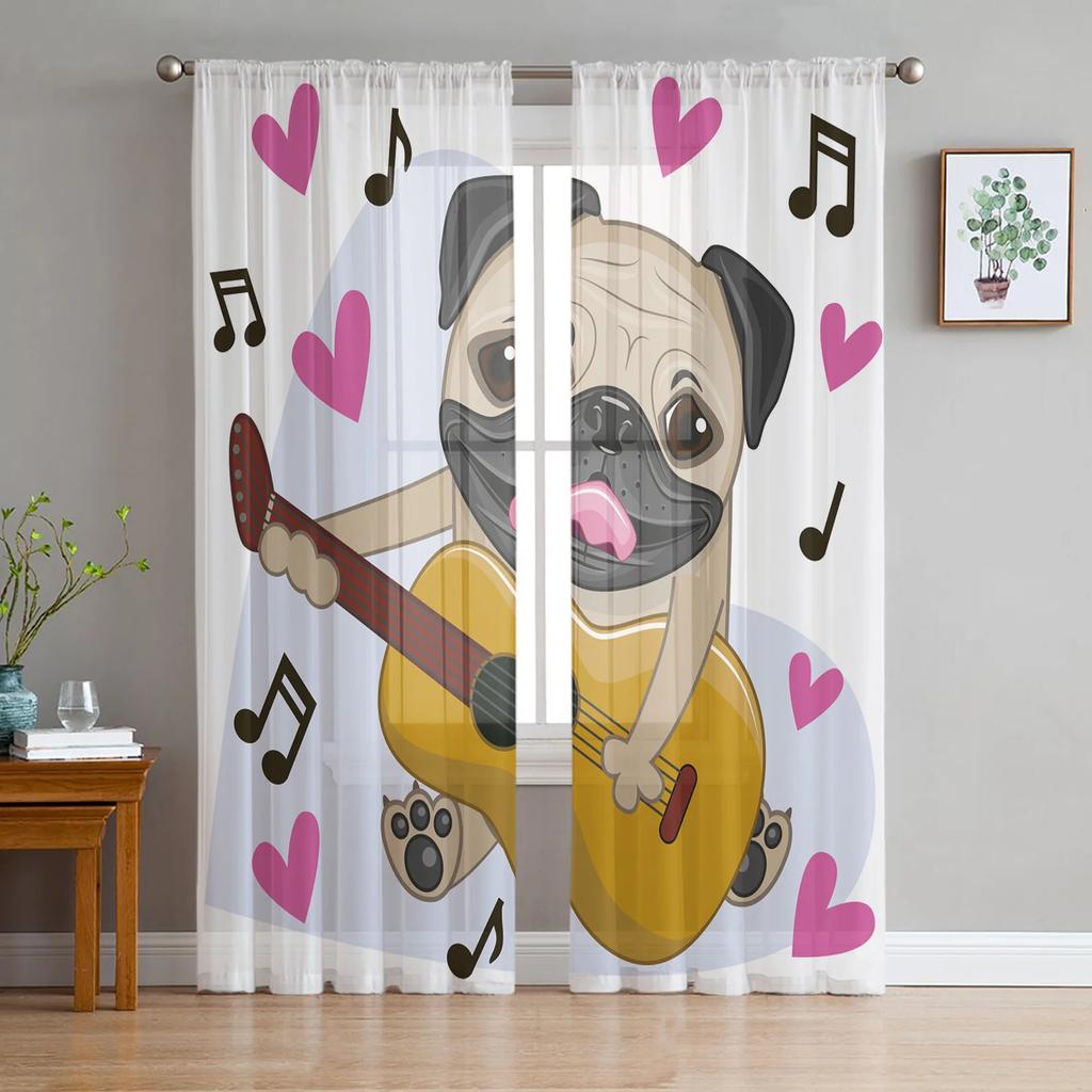 Pug Dog Music Funny Curtain Living Room Voile Window Blinds Bedroom Tulle Drape Kitchen Cortinas Hall Curtains With Sheer Polyester Perfect For Great