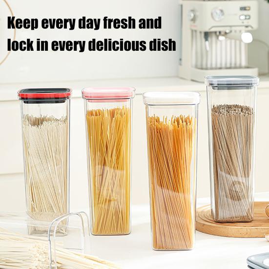 Tato vysoce kvalitní úložná nádoba má velmi průhledný design, který vám umožní snadno na první pohled sledovat množství nudlí a včas doplnit, čímž zabráníte přerušením během vaření.. Jeho vylepšený zesílený těsnicí silikonový kroužek a bezpečná přezka účinně izolují vzduch, vlhkost a hmyz a udržují nudle suché, čerstvé a bez znehodnocení.. Obdélníkový protáhlý tvar pojme dlouhé těstoviny jako špagety, sobu a makarony, aniž by se zlomily, což zajišťuje pohodlí a úhlednost..