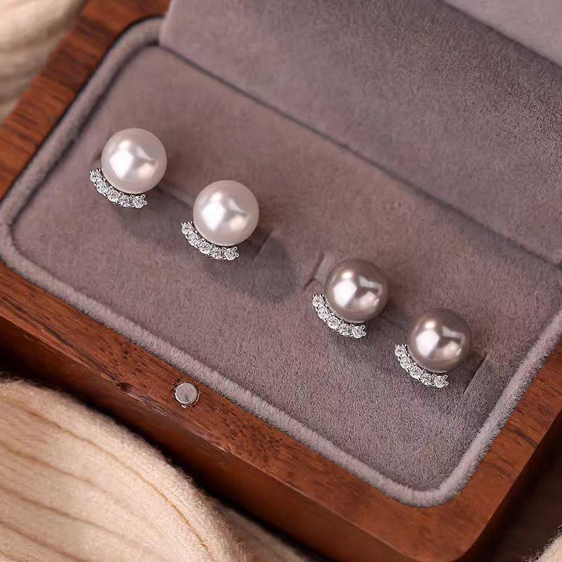Silver-Gray Pearl Zirconia Stud Earrings – Lightweight Luxury for Everyday Wear