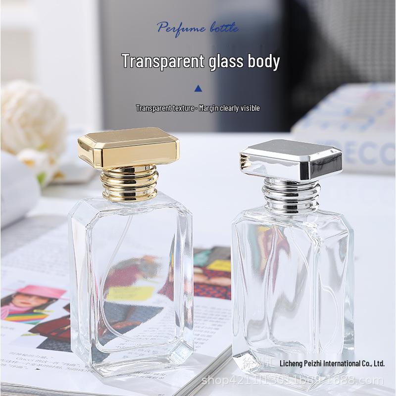 T-shaped Cap Glass Perfume Bottle, 50ml Flat Square with Angled Corners