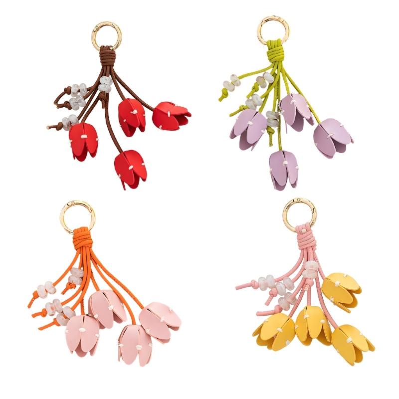 Elegant Tulips Shaped Leather Keychain With Beaded Accent For Bags And Keys Stylish Accessory Gift