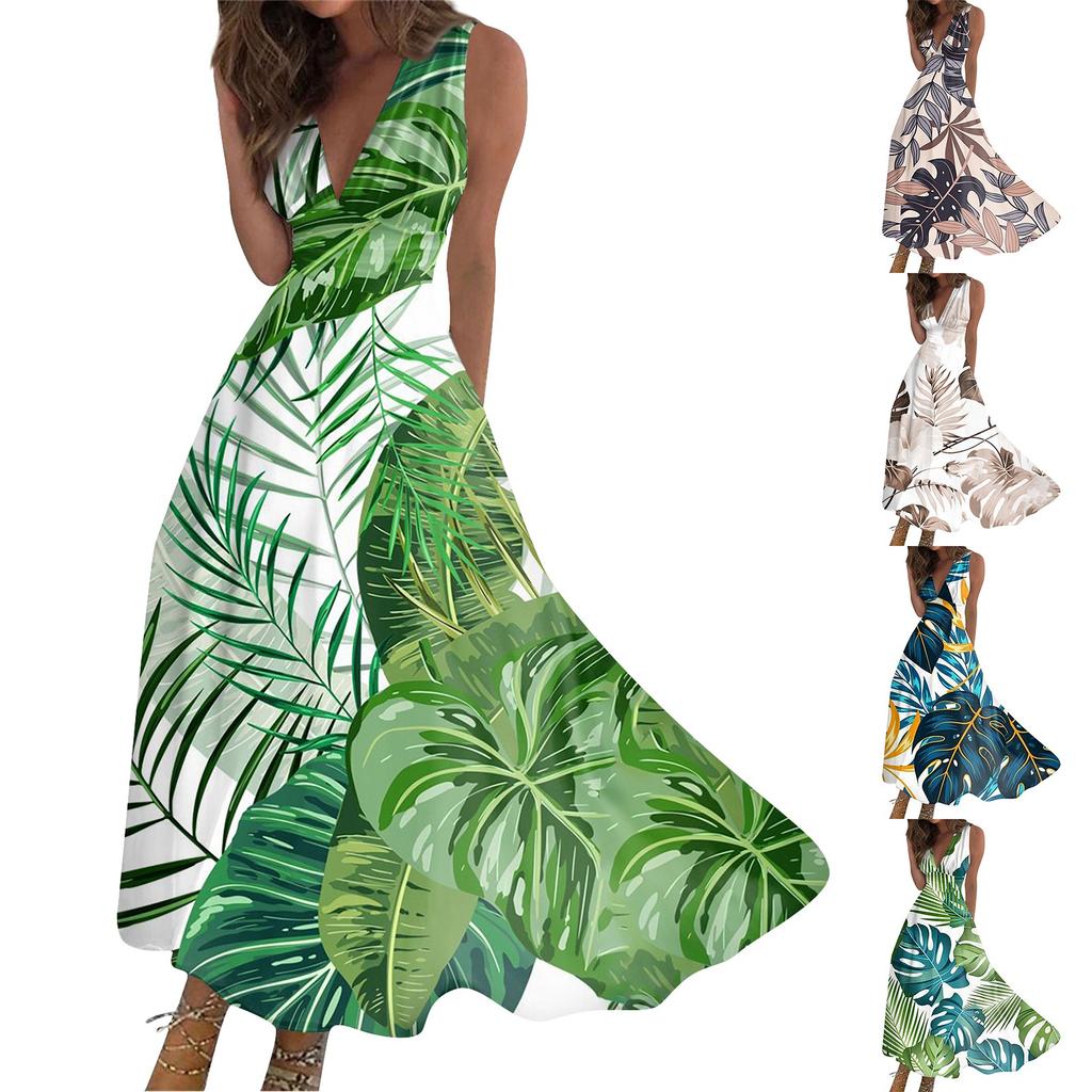 Women's Summer Fashion Hawaiian Print V-Neck Sleeveless Tunic Casual Dresses