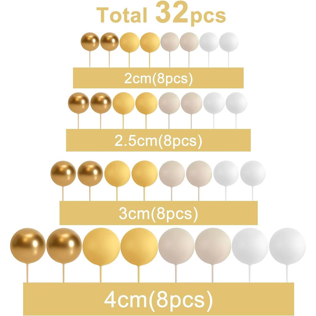 Package includes: 32 pcs balls cake decorations with different colors and sizes. They are gold, yellow, white, off white colors as picture showed, 8 pieces of each color.