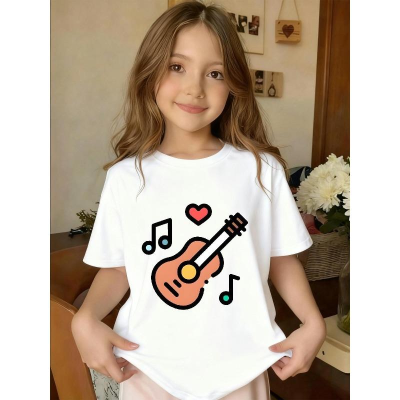 European sizes Adorable T-Shirt Featuring a Cartoon Guitar Design, with a Round Neck And Short Sleeves