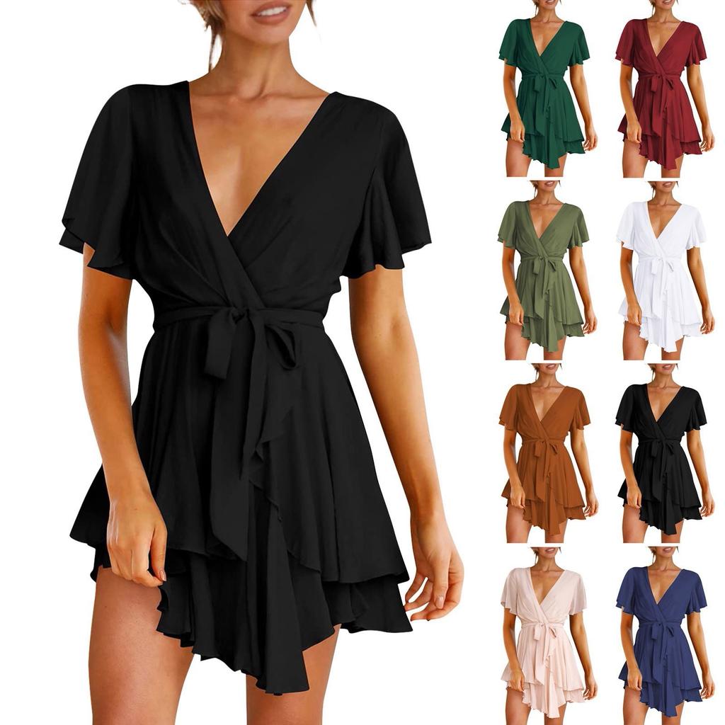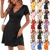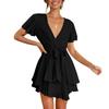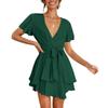 Women's Fashion Casual Color Short Sleeve V-Neck Loose Waist Ruffle Dress