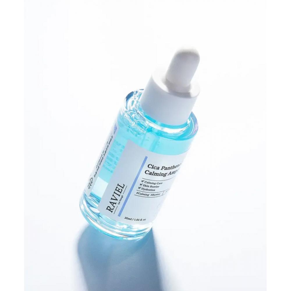 RAVIEL CICA Panthenol Calming Ampoule 30ml is a low-irritation ampoule designed to quickly calm sensitive skin and strengthen the skin barrier. It includes 84% Centella Asiatica extract (86,469ppm) and a 5-component CICA COMPLEX to assist in calming and moisturizing the skin. The 50,000ppm Dexpanthenol supports skin barrier enhancement and is formulated based on SCIE-level research to calm the skin and improve moisture levels. The combination of Panthenol and Hyaluronic Acid enhances barrier and moisture, and the patented Exosome technology allows this formula to penetrate deeply into the skin. With a pH of 5.5 to 6.5, this mildly acidic formula helps maintain healthy skin, and its viscous toner-like texture is suitable for use throughout the year on oily to dry combination skin.