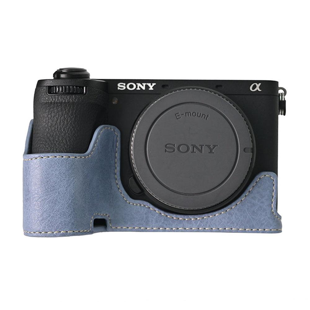 Půl pouzdro na fotoaparát z PU kůže s texturou liči pro Sony A6700 A6400 A6300 A6100 A6000 ZVE10 ZVE10II ZVE10M2 Spodní otevírací kryt s popruhem