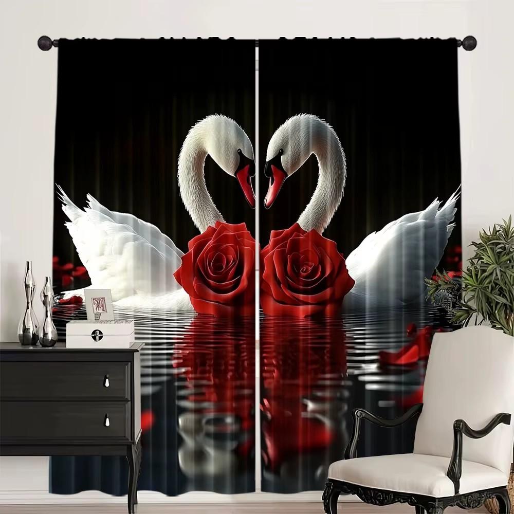 Romantic Swan Red Rose Print Curtains Flat Perfect Valentine Day Bedroom Living Room Window Decoratio Set Of 2 Made Polyester Great Decor