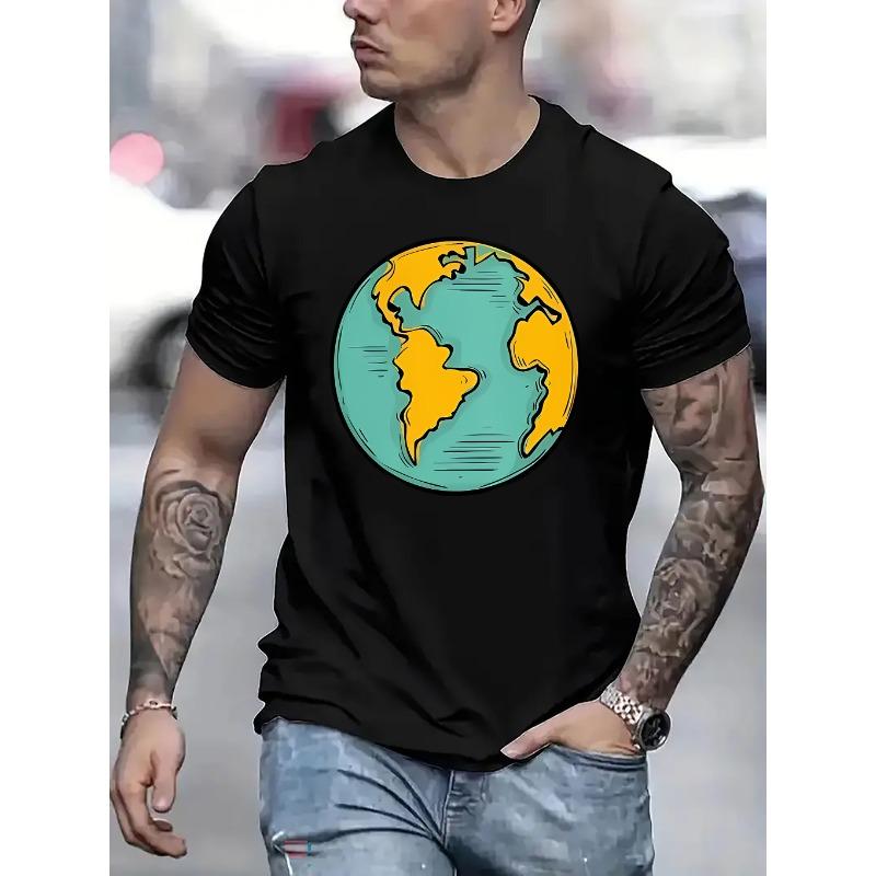 European Size Men's Earth-Themed Short Sleeve T-Shirt - & Continent Print Round Neck Summer Casual Tee, Machine Washable Opaque Top for Camping