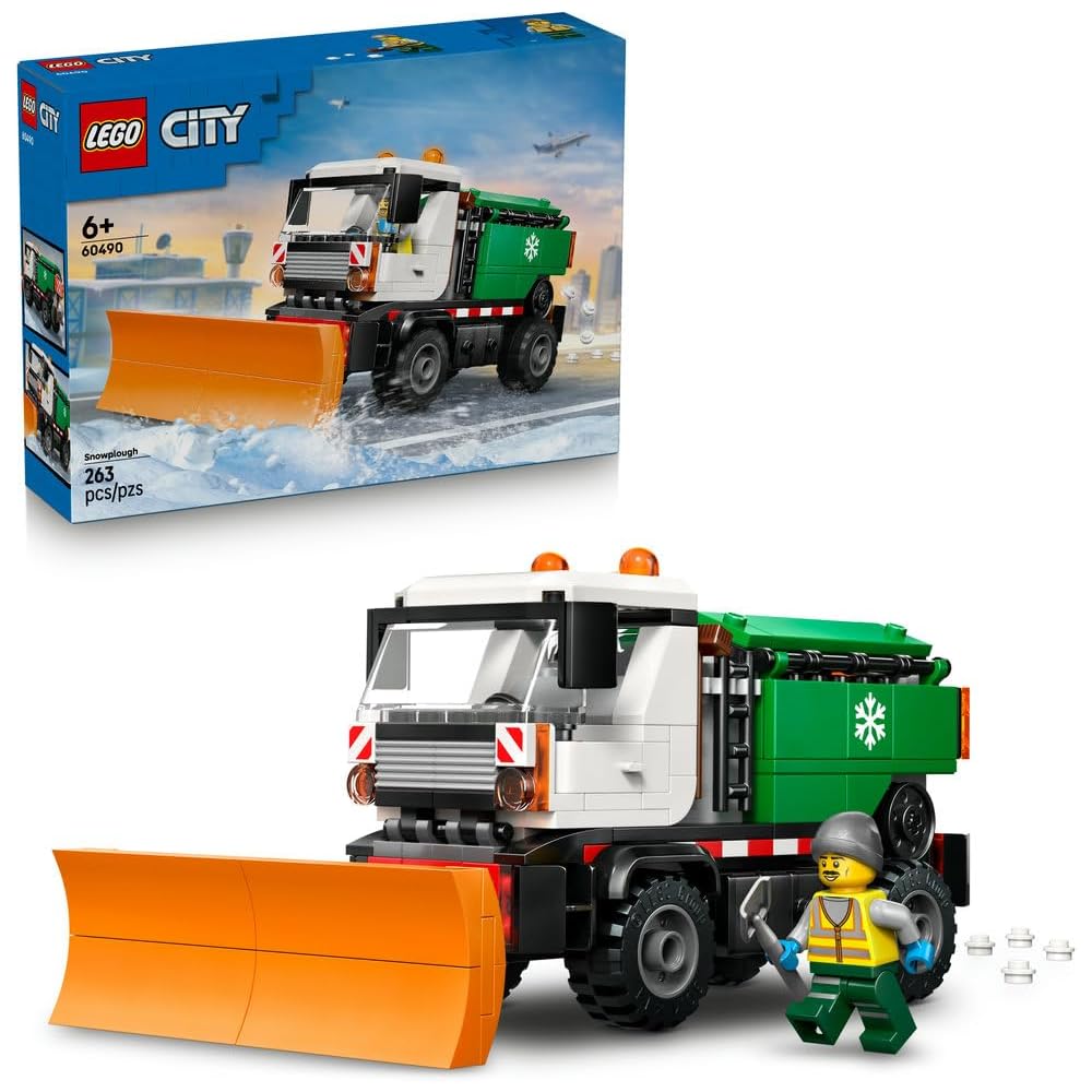Set Contents – Includes all the parts needed to build a snowplow with thick rubber tires, a front plow, and a salt-spreading mechanism, plus one driver minifigure.