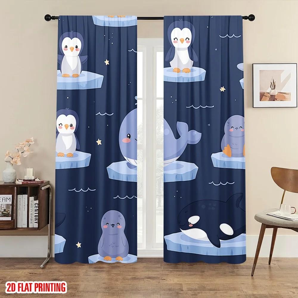 Set Of 2 Cartoonish Penguin Curtains Polyester Kids Room Window Decor Cute Home Curtain Light Blocking With Rod Pocket Ideal For