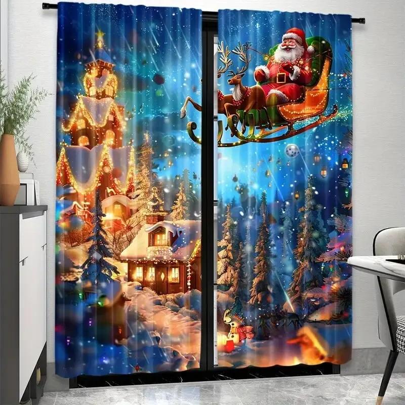 Festive Santa Claus Curtains Christmas Window Decor Polyester Drape Home Room Darkening Set Of 2 Made With Rod Pocket