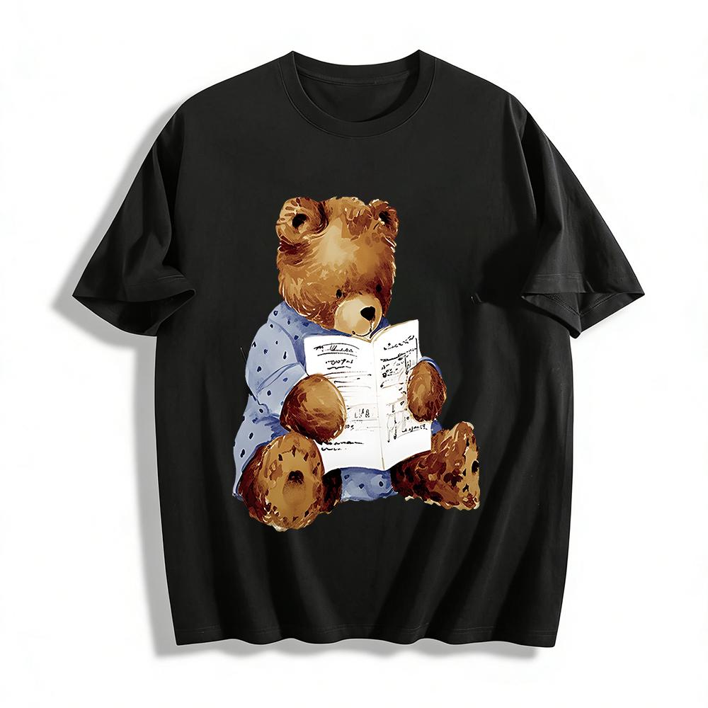 Cute Reading Bear Print Casual Top Kids Boys Girls Breathable Loose Fit Crewneck Shirt Pure cotton T-shirt