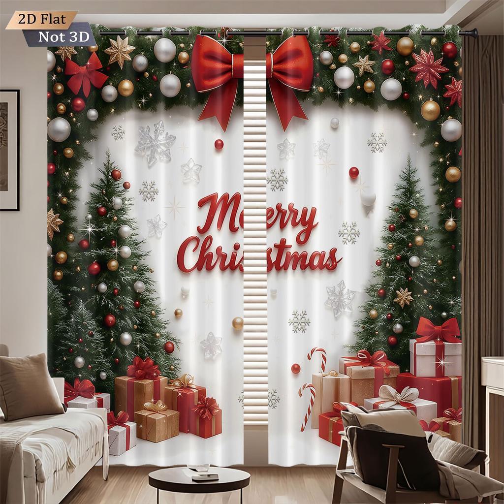 Set Of 2 Happy Christmas Tree Printed Perforated Curtains Multi Size Living Room Insulation Festival Decoration Curtain With Light Blocking Polyester