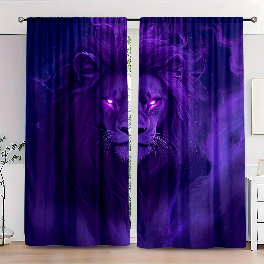 Set Of 2 Curtains Featuring Dark Purple Lion Patterns Flowing Mist Glowing Eyes Showcasing Unique Fantasy Curtain Blackout Polyester