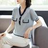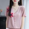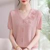 Women's Summer Fresh V-Neck Fake Cardigan Knit Top Floral Embroidered Ice Silk Short Sleeve Tee