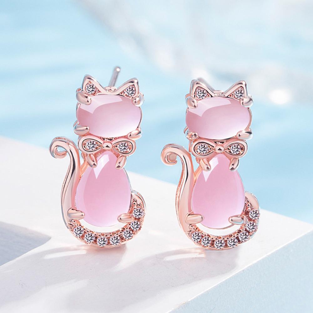 18K Rose Gold Plated Silver Cat Earrings Pink Quartz Imitation Cute Kitty Stud Earrings for Women Trendy Jewelry Gift