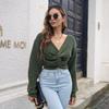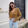 Balloon Sleeve Sweater Women Solid Color Cropped Knotted V Neck Autumn Winter Sizes S to L