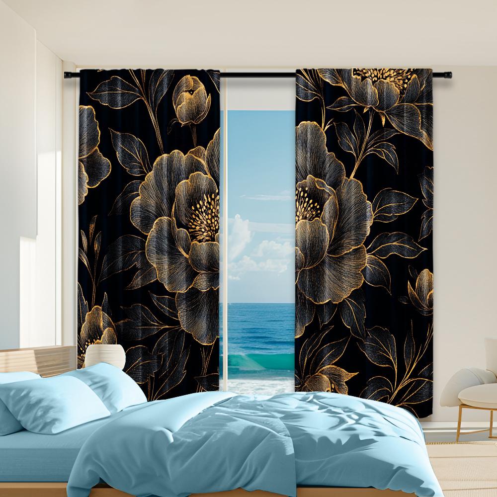 Set Of 2 Versatile Polyester Transparent Curtains Home Decoration Black Golden Floral Use Bedrooms Living Rooms Curtain Ideal For Room