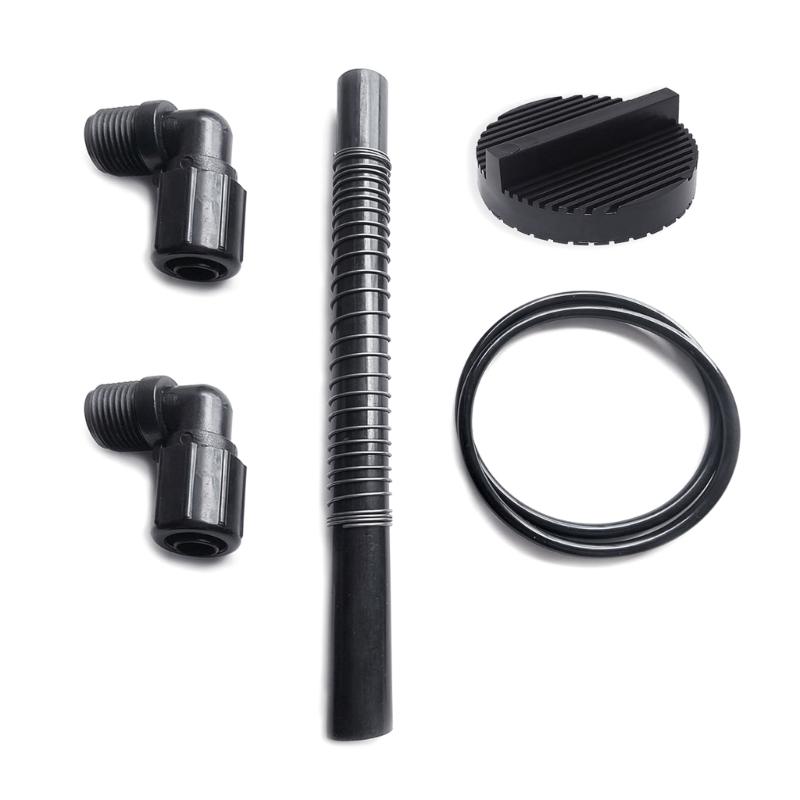 The comprehensive set includes a flexible PVC feed tube (R172091), two 90°NPT fittings with nut (R172272), chlorine resistant VMQ/EPDM O gasket (R172009), stainless steel spring support, and filter screen for uninterrupted operations.