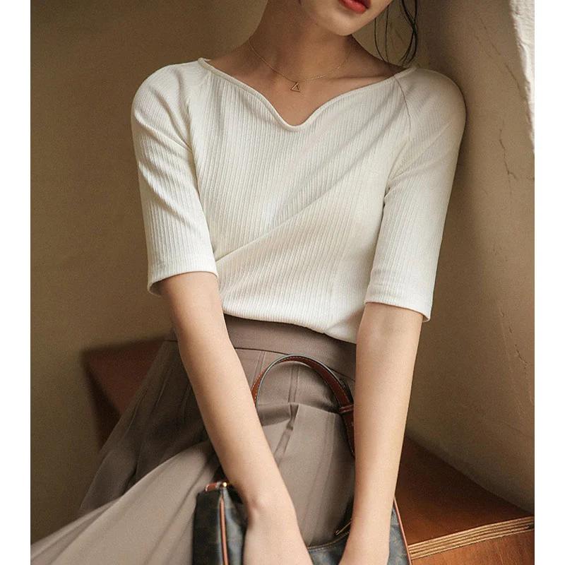 Summer Women V Neck Half Sleeve Knit Top Slim Fit Base