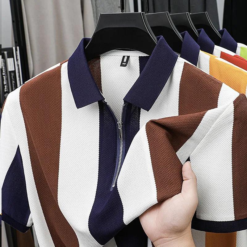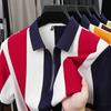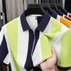 Men Casual Striped Polo Shirt Contrast Collar Waffle Knit Tee