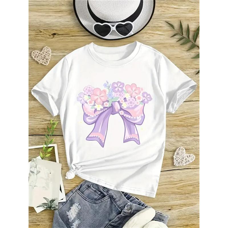 European Size Childrens Round-neck Short-sleeved T-shirt with Purple Bowknot and Floral Pattern Print