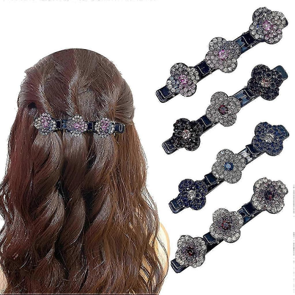 4PCS Sparkling Crystal Stone Braided Hair Clips, Four-Leaf Clover Chopped Hairpin Duckbill Clip with 3 Small Clips, Braided Hair Clip with Rhinestones