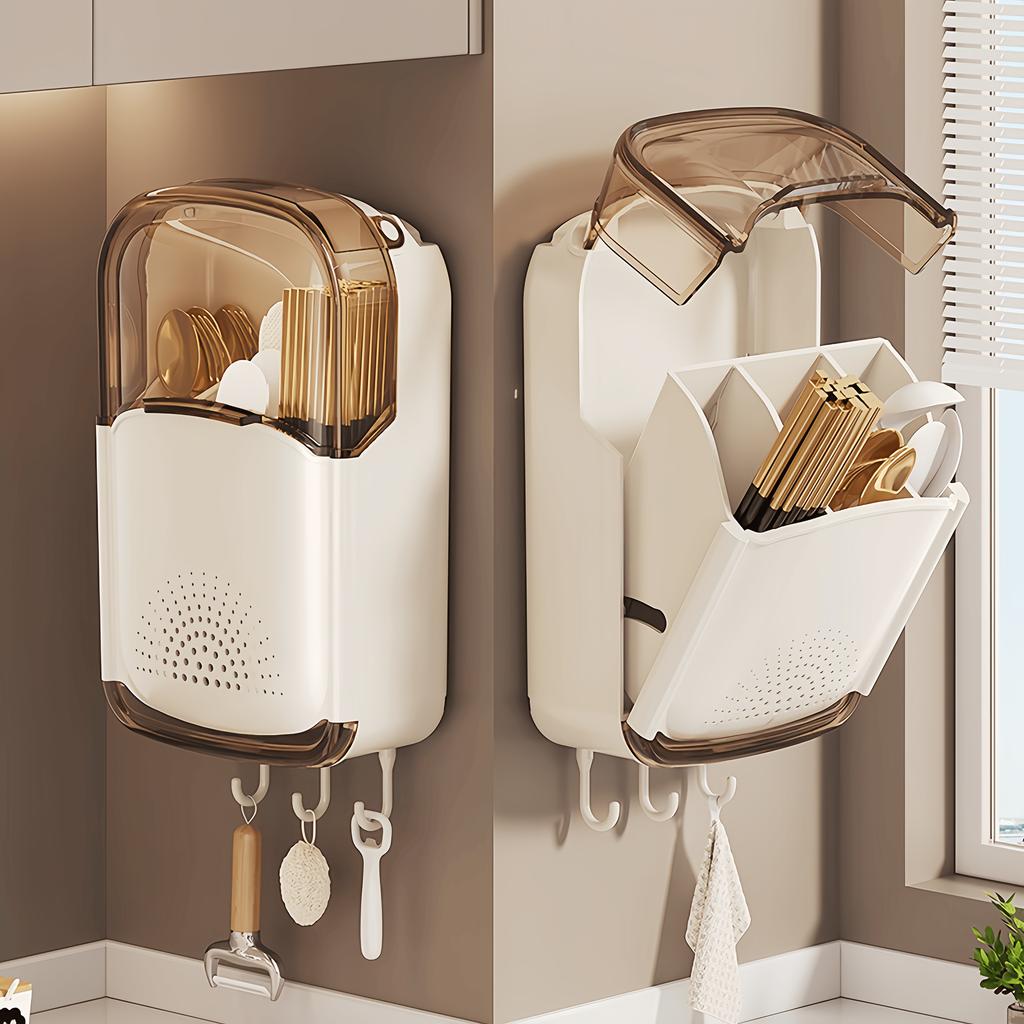 A Wall-Mounted Kitchen Chopstick Holder - a No-Drill Cutlery Storage Box with a Draining Tray, Multifunctional Kitchen Shelf with Hooks, Removable
