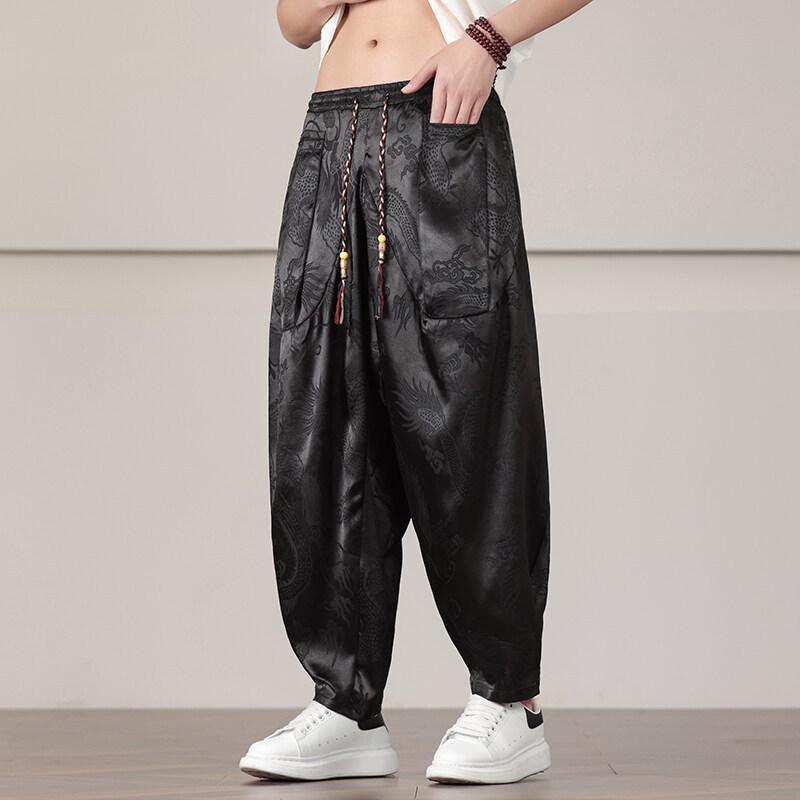 Men's Black Dragon Jacquard Elastic Waist Baggy Harem Casual Pants