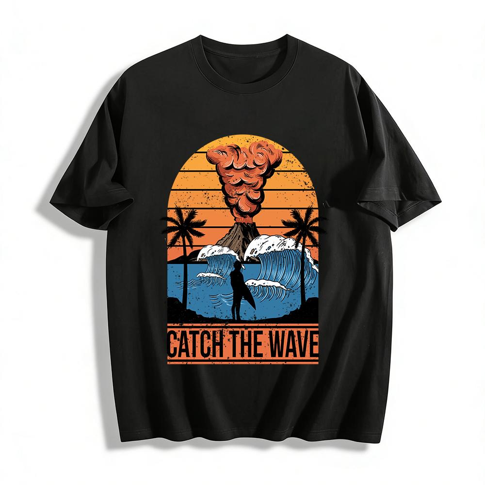 Vintage Volcano Surf Print Tee Outdoor Beach Vacation Top Pure cotton T-shirt