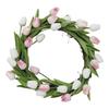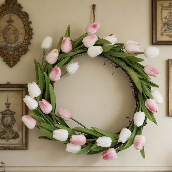 Realistic Simulation For Long-Lasting Freshness: Made from high-quality artificial tulips and green leaves, the wreath replicates the delicate texture and soft hues of real flowers with remarkable accuracy. Its full-bodied shapes and natural coloration provide an authentic look that remains vibrant over time. Unlike fresh blooms, this wreath requires no watering or maintenance, ensuring enduring beauty throughout the seasons.