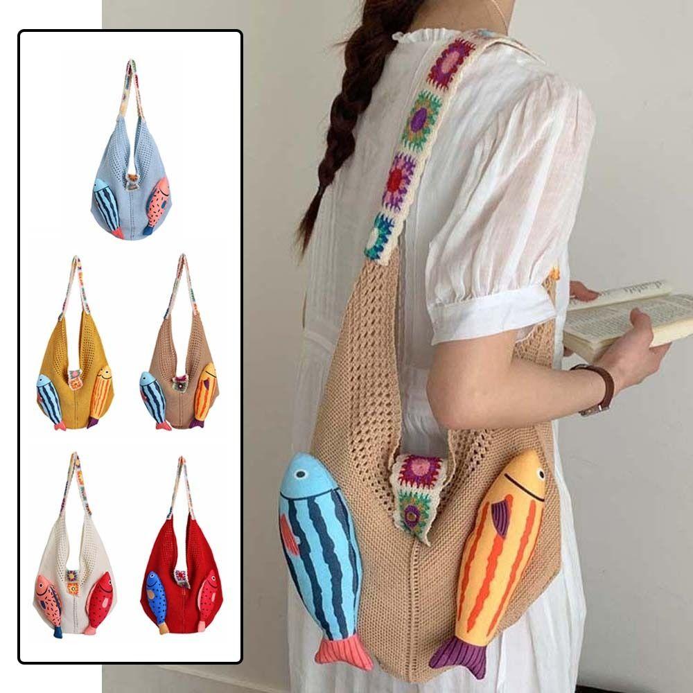 Fish Cotton Crochet Shoulder Bag Summer Tassels Beach Handbag Leisure Hollow Out Woven Bag Beach