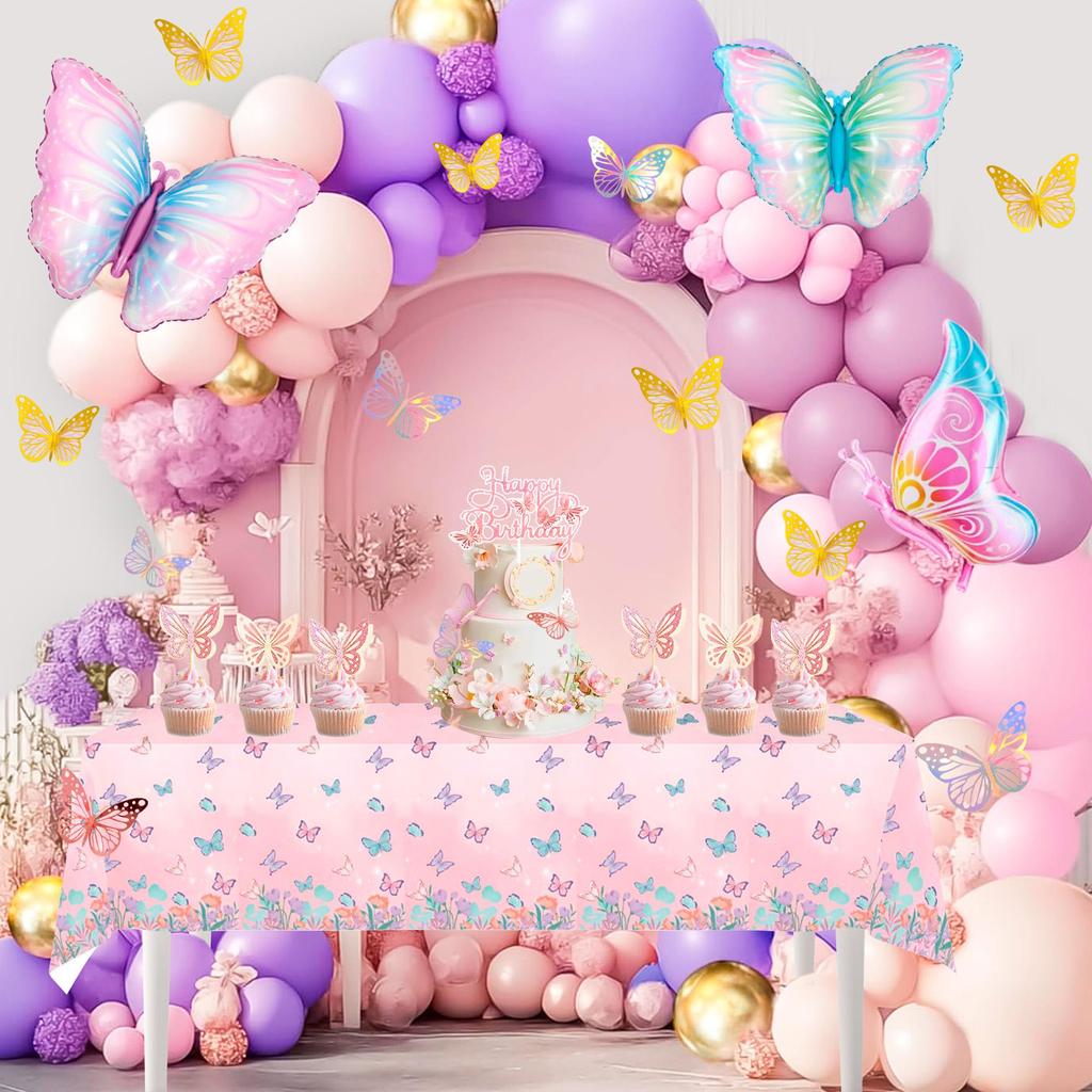 118 ks Motýlí narozeninové dekorace, Motýlí narozeninové party potřeby - Motýlí party balónky Dortové zápichy Ubrusy Nástěnné dekorace atd.