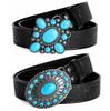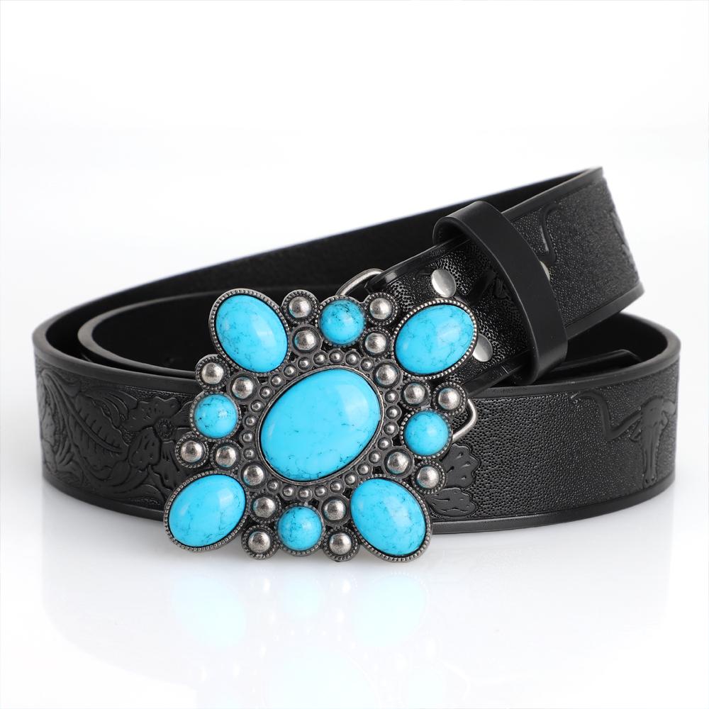 Fashion Bohemian Style Women's Belt Turquoise Inlaid Metal Buckle Personality Vintage Black Embossed PU Leather Belts Plus Size