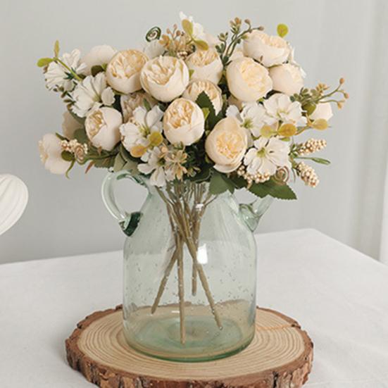 This artificial flower bouquet offers a lifelike appearance without the hassle of watering, pruning, or sunlight. Crafted with high-simulation technology, it maintains its delicate beauty over time, making it an ideal solution for those seeking low-maintenance decor. The natural look is so realistic that it's hard to distinguish from real flowers up close.