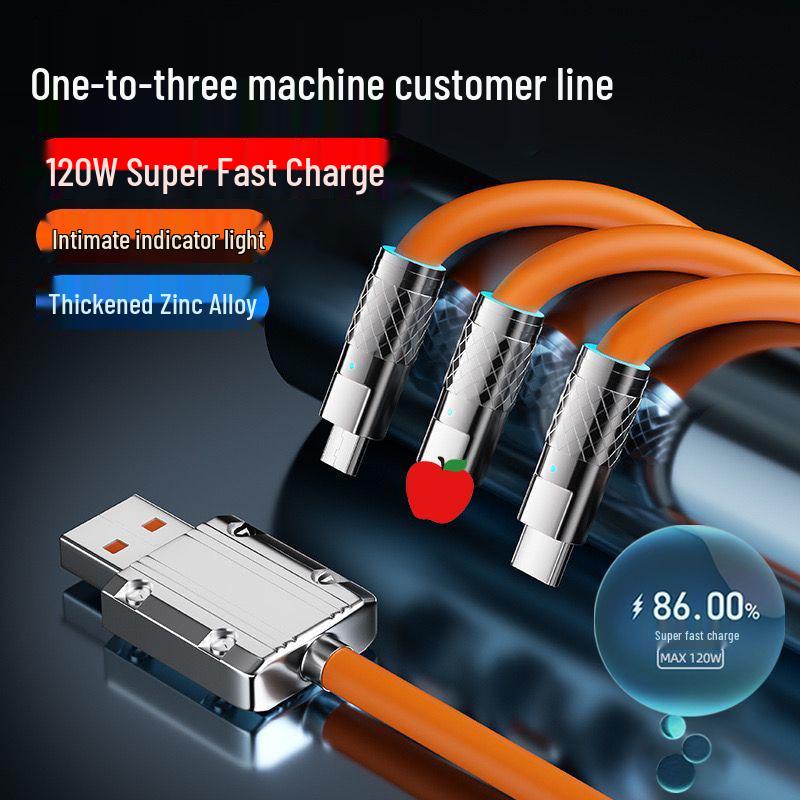 120W Super Fast Charge 3-in-1 Cable for Apple, Huawei, Type-C, and Android with 6A Flash Charge Capability