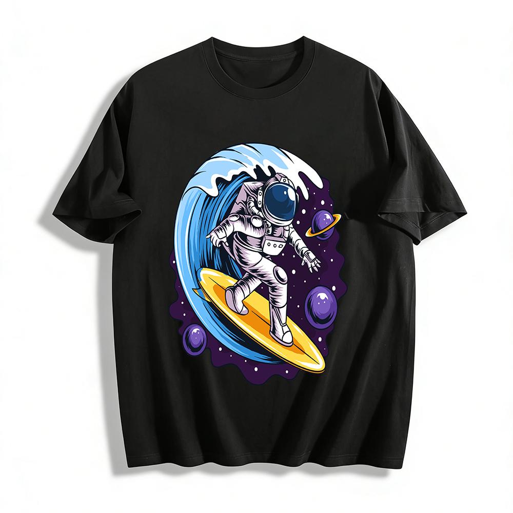 Astronaut Surfing In Space Graphic Casual Short Sleeve T-Shirt Pure cotton T-shirt