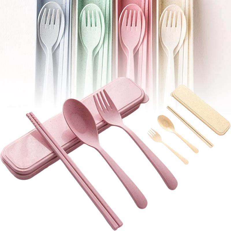 Wheat Straw Tableware Fork Spoons Chopsticks Plastic Portable Cutlery Set For Travel Student Dinnerware Utensil Box