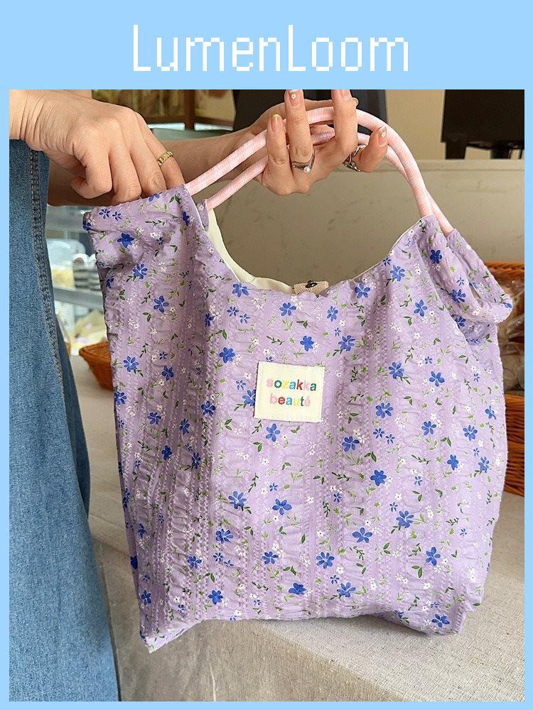 Stylish Korean Floral Print Canvas Tote Bag For Spring Summer With Large Capacity And Soft Design Ideal For Beach And Vacation Activities