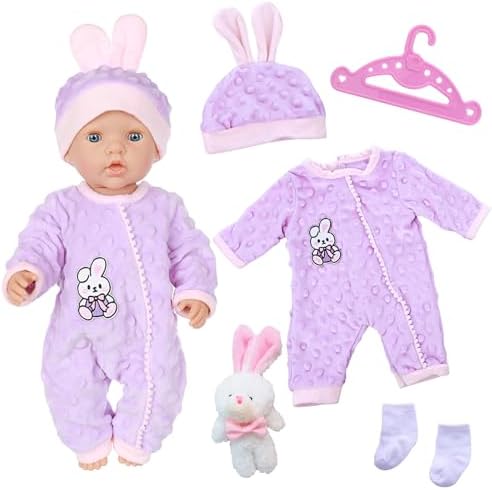 6-Piece Bunny Baby Doll Clothes Outfits for 12-18 Inch Dolls (30-43 cm), Includes Bunny Hat Socks & Hanger, Newborn Doll Clothing