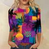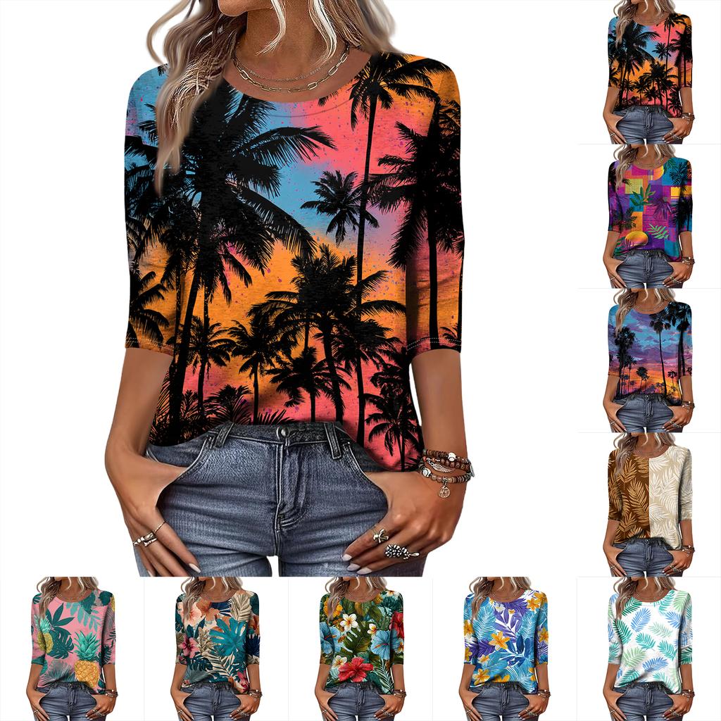 Women's Fashionable Casual Round Neck Three-quarter Sleeve Hawaiian Print T-shirt Top
