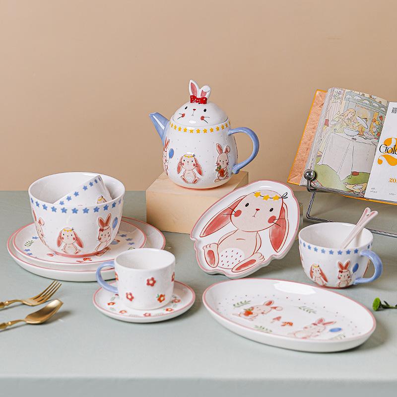 Cartoon Rabbit Relief Ceramic Tableware,Fish Plate Rice Bowl Kitchen Cutlery Set Gift,High Appearance Easter Coffee Cup Dish Set