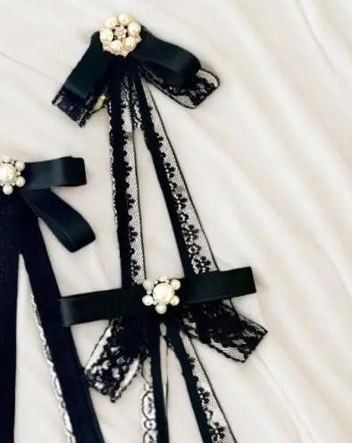 Fashion Black Lace Brooch Bow White Pearl Brooch Tie For Women Clothing Neckline Decoration Ribbon Tie Jewelry Accessories