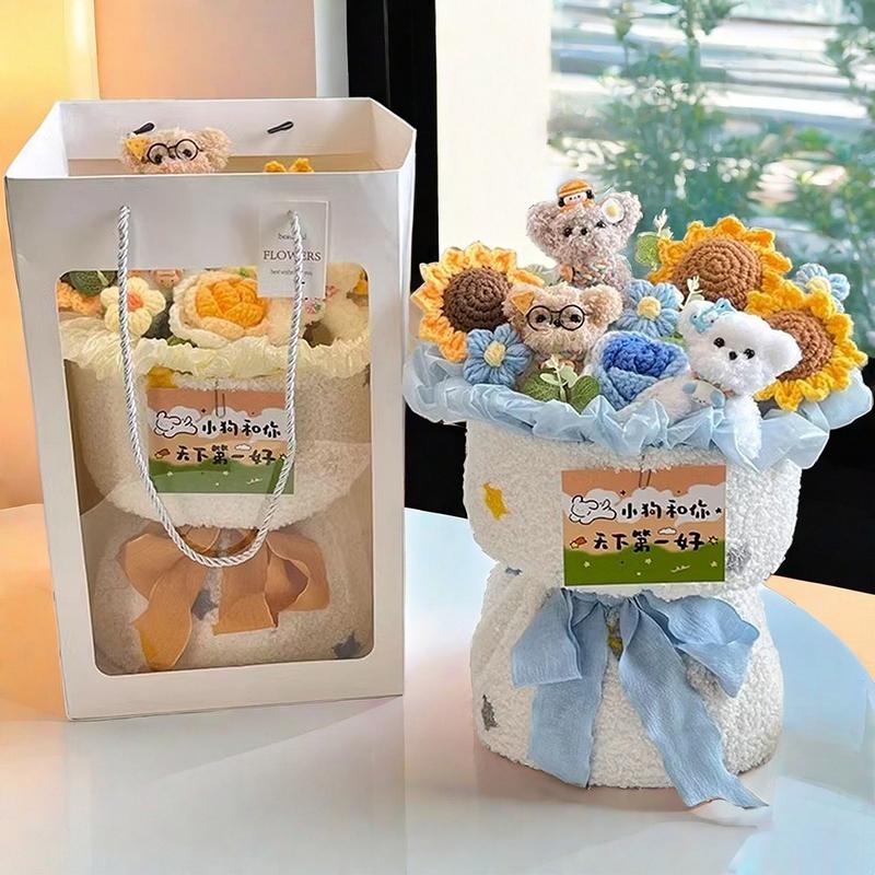 Cute Dog Doll Hand-Knitted Crochet Flower Bouquet Finished Crochet Flower Bouquet Mother's Day Gifts Graduation Bouquet