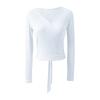 Women Solid Color V Neck Long Sleeves Straps Back Stretchy Crochet Dance Tops Gym Yoga Ballet